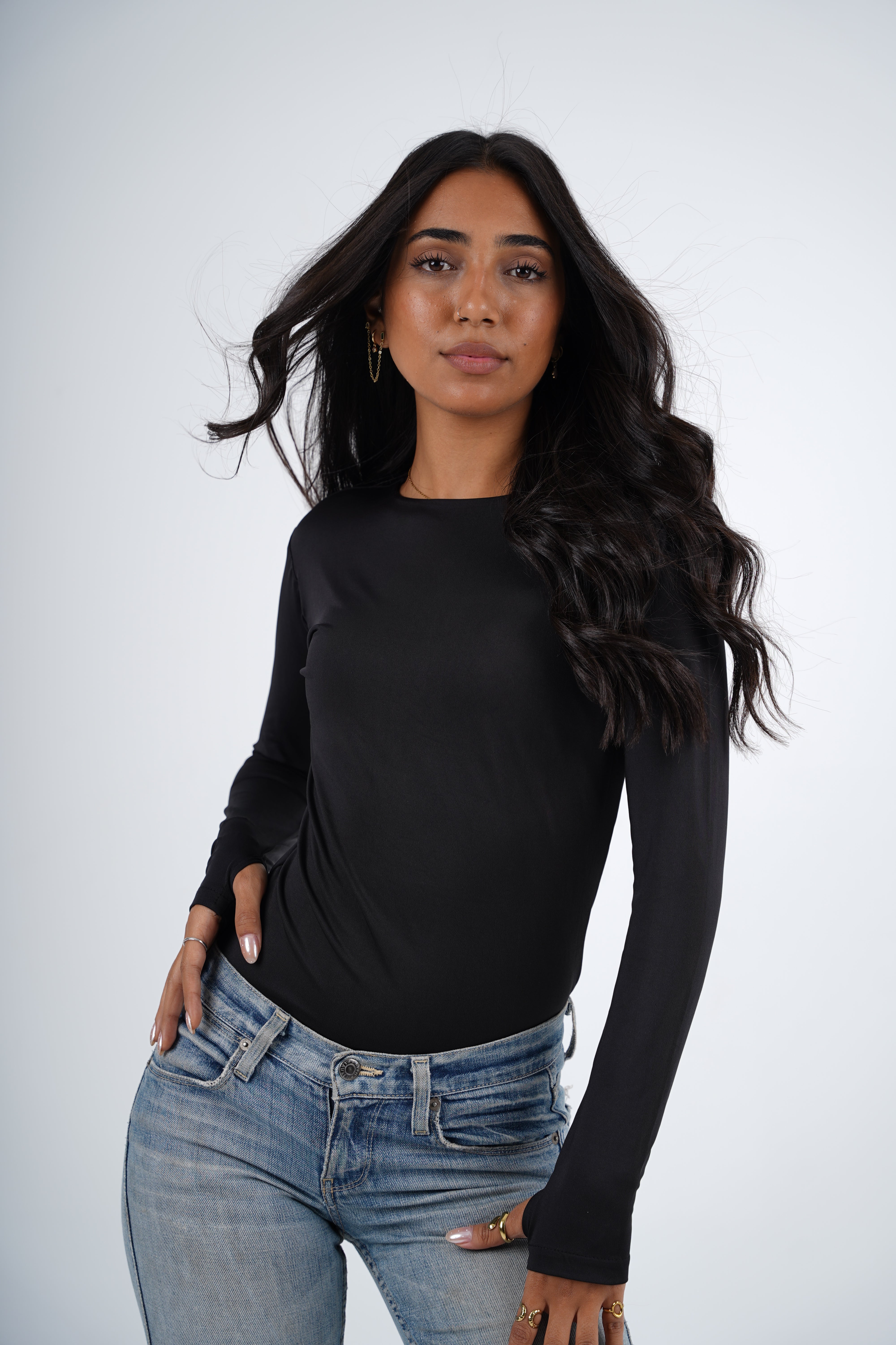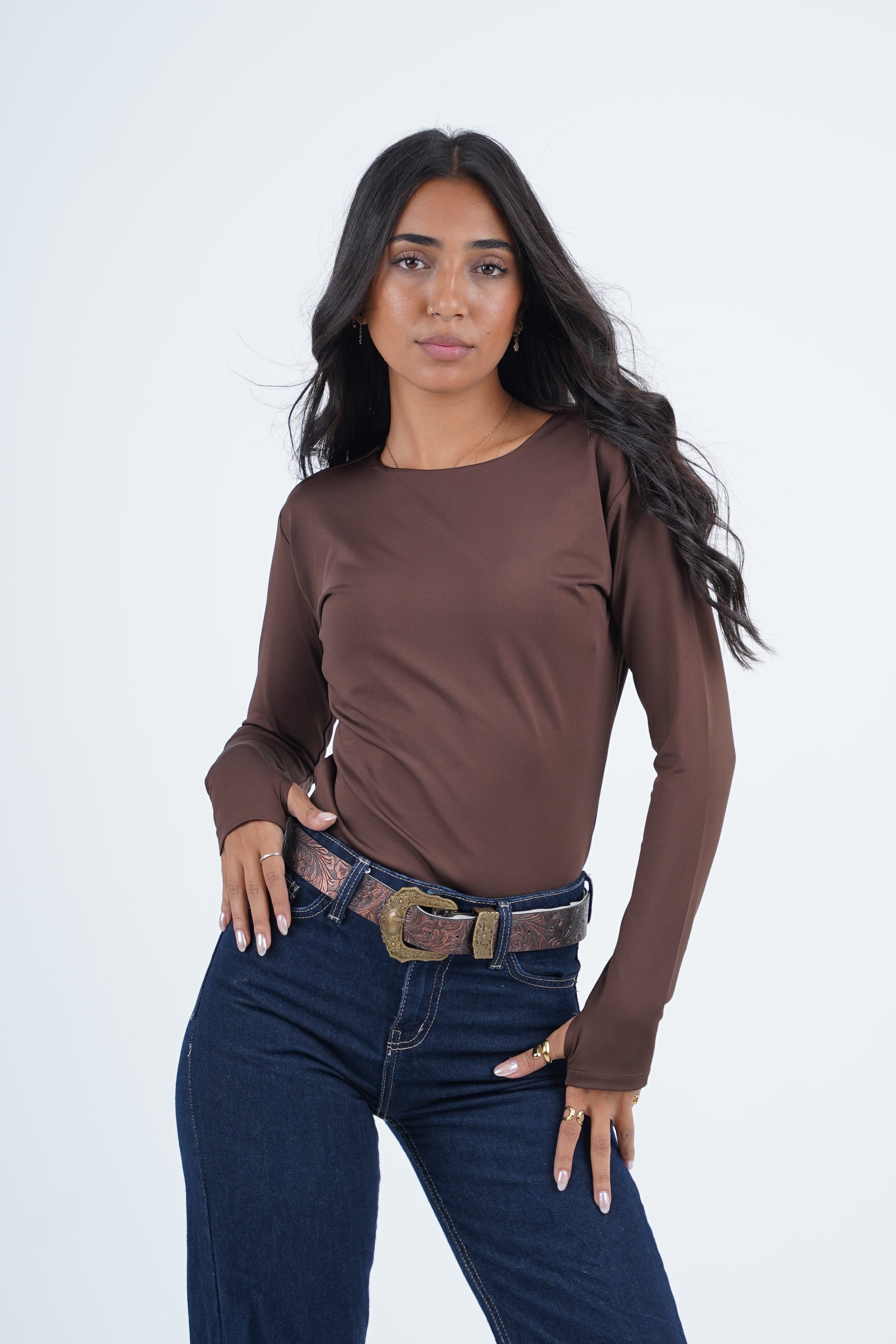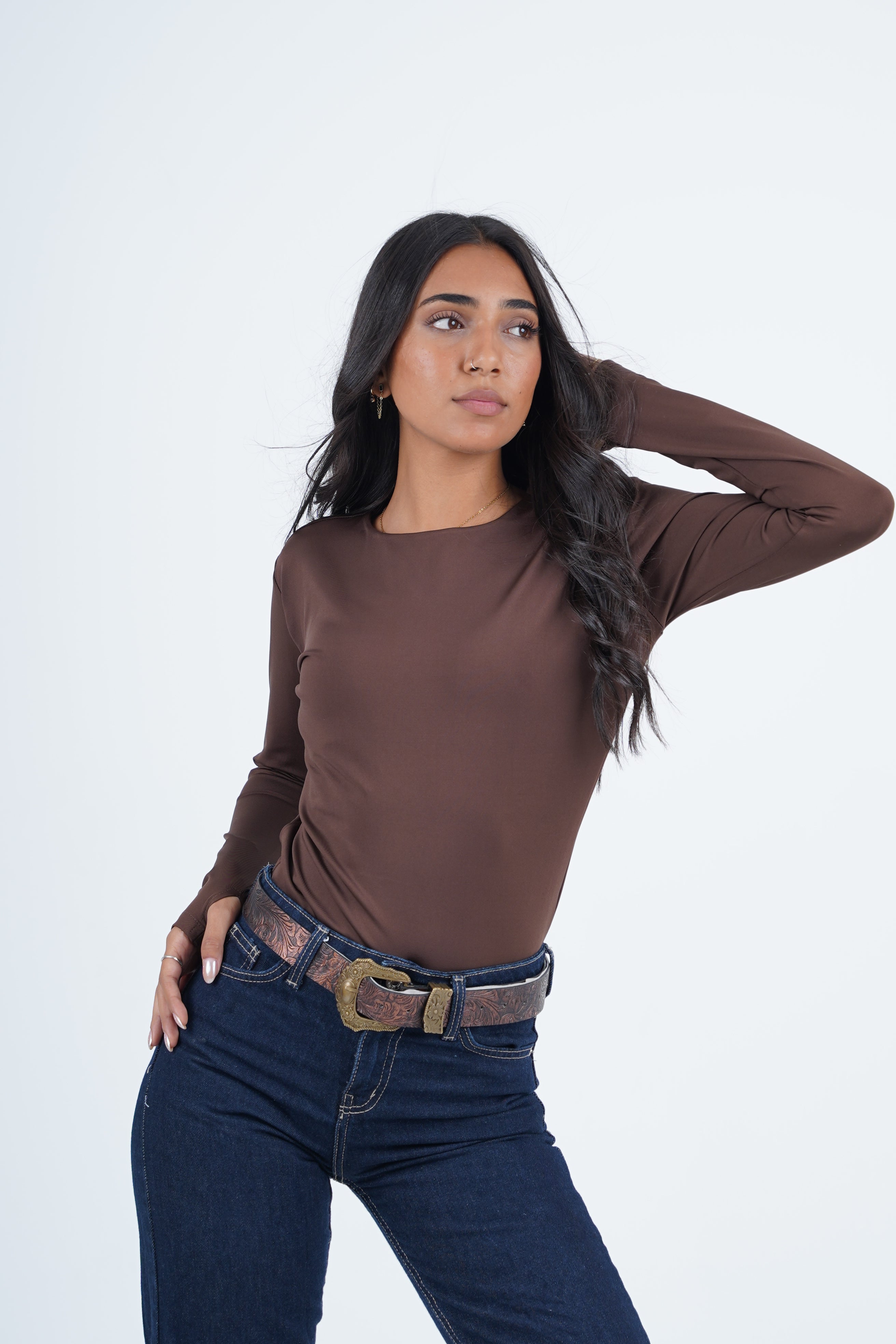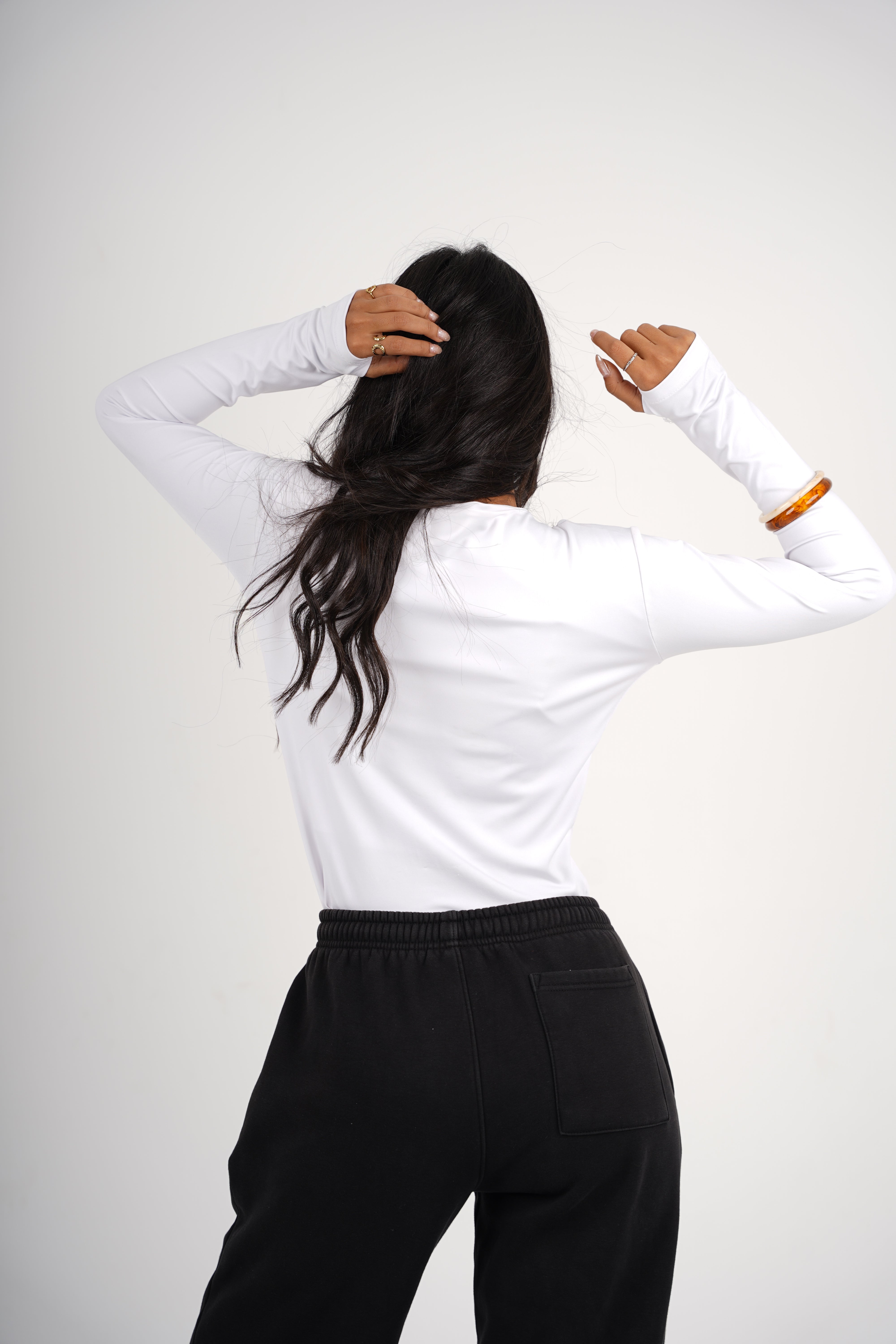 A double-layered round neck top designed for everyday ease and elevated simplicity. The structured silhouette feels smooth against the skin, while the open-finger sleeves add a modern, understated edge. A timeless essential that balances comfort, shape, and style.